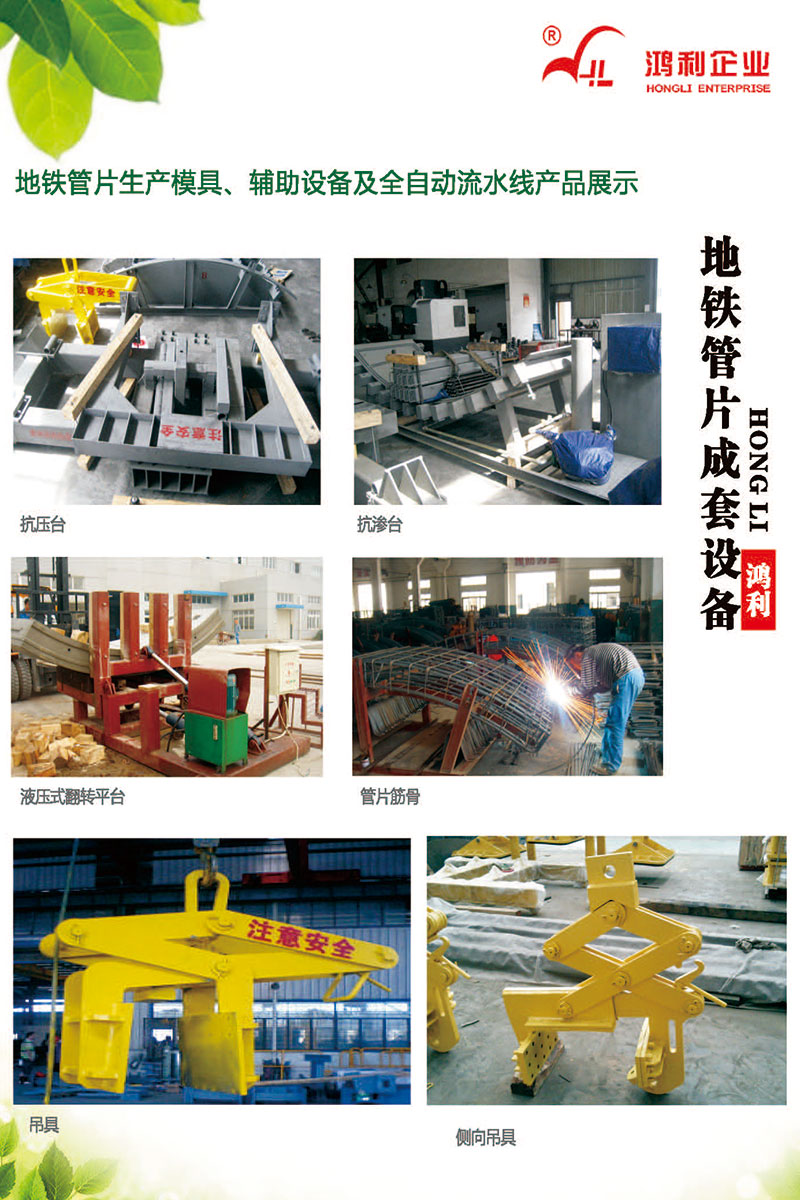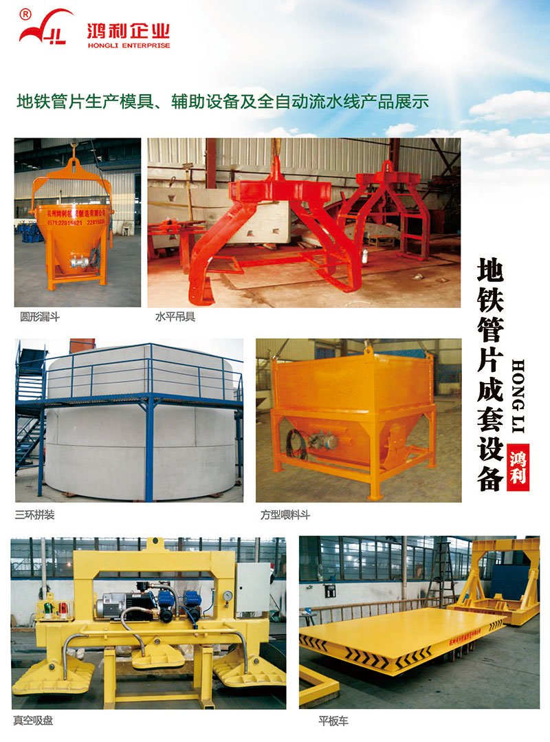 自行研發(fā)了本項目,該項目運用PLC控制技術(shù)、現(xiàn)場總線技術(shù)、傳感器技術(shù)等先進自控技術(shù),實現(xiàn)了盾構(gòu)管片生產(chǎn)自動化的要求。同時,項目采用了:行走裝置采用液壓單向傳動方式,以保證流水線上的模具車運行平穩(wěn);液壓單向傳動頂端裝有一個單向推力臺車,通過液壓缸推動模具臺車向前運行;振動房內(nèi)設(shè)置了自主研發(fā)的氣囊隔振平臺或多輪式架空平臺,使振動時避免能量傳到地面造成能量的損失,又減少對模具輪軸承的損傷。同時又最大限度的保證了管片的成型精度;末端管片搬運單元設(shè)置了機械式自夾緊出模水平吊具,安全可靠。結(jié)合自主研發(fā)的機械式管片翻轉(zhuǎn)平臺(采用渦輪蝸桿減速機和齒輪齒條傳動機構(gòu))比傳統(tǒng)的翻轉(zhuǎn)平臺更加的高效可靠,使管片成豎直狀態(tài),再利用自主設(shè)計的側(cè)向吊具把管片平穩(wěn)吊至自主研發(fā)的軌道平板車,該平板車采用變頻技術(shù)與鋼絲繩牽引所結(jié)合,有行走平穩(wěn),使用壽命長等特點。場外還設(shè)置了一整套檢測設(shè)備如抗?jié)B試驗臺、抗彎抗拔試驗臺,三環(huán)拼裝臺等全套設(shè)備。